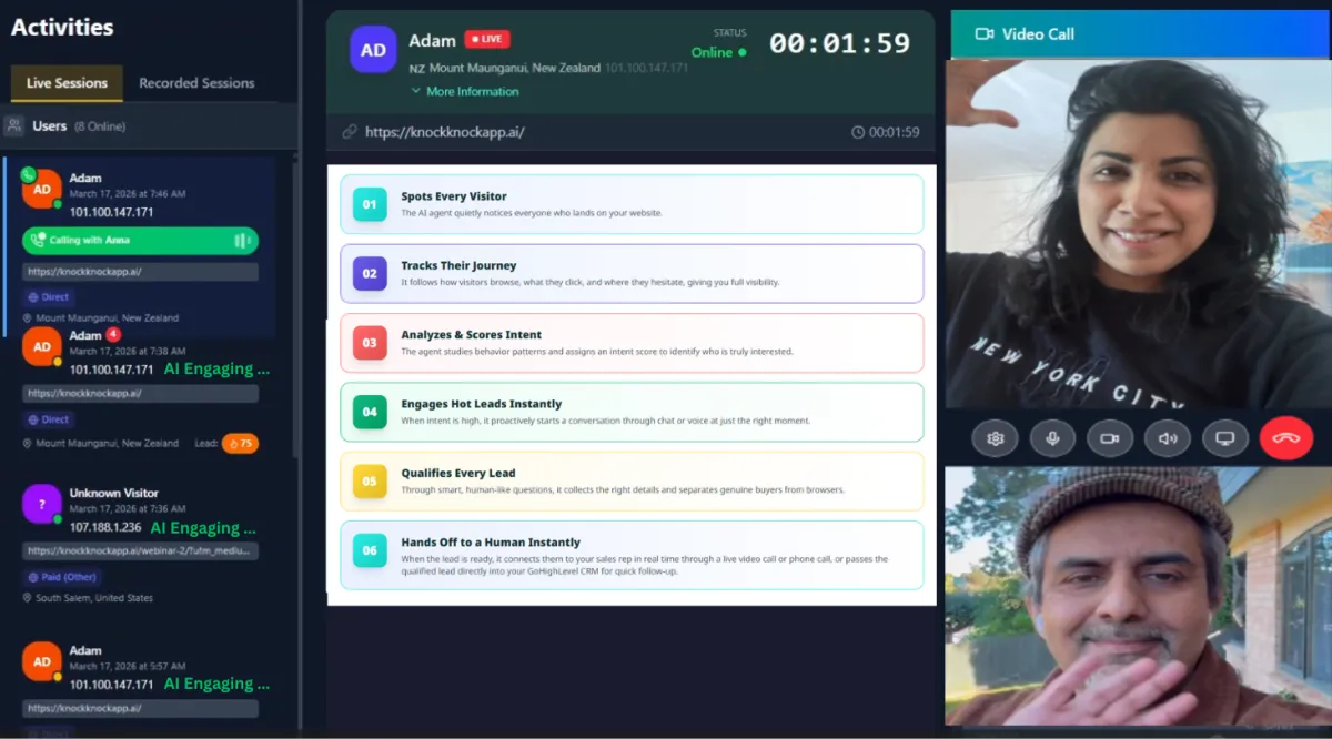 Visitor intelligence. Intent scoring. AI chat and voice. Live video handoff. Lead capture. CRM sync. All inside one dashboard.